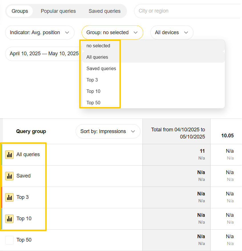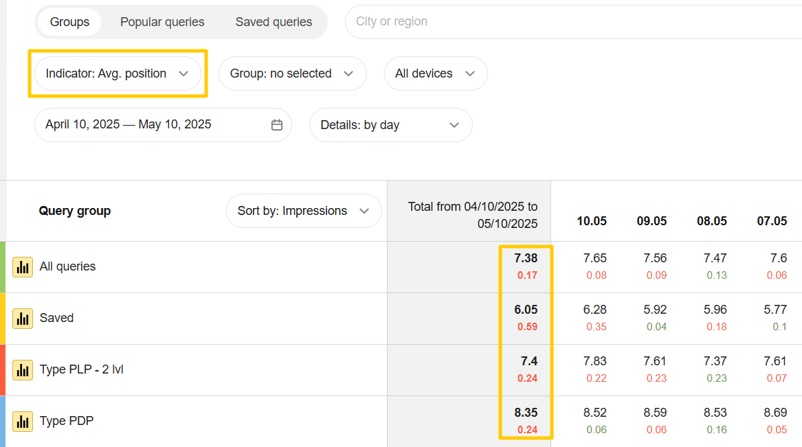 To view the overall dynamics of the indicator, choose Avg. position from the list. To track trends for specific queries, choose the Popular queries or Saved group.