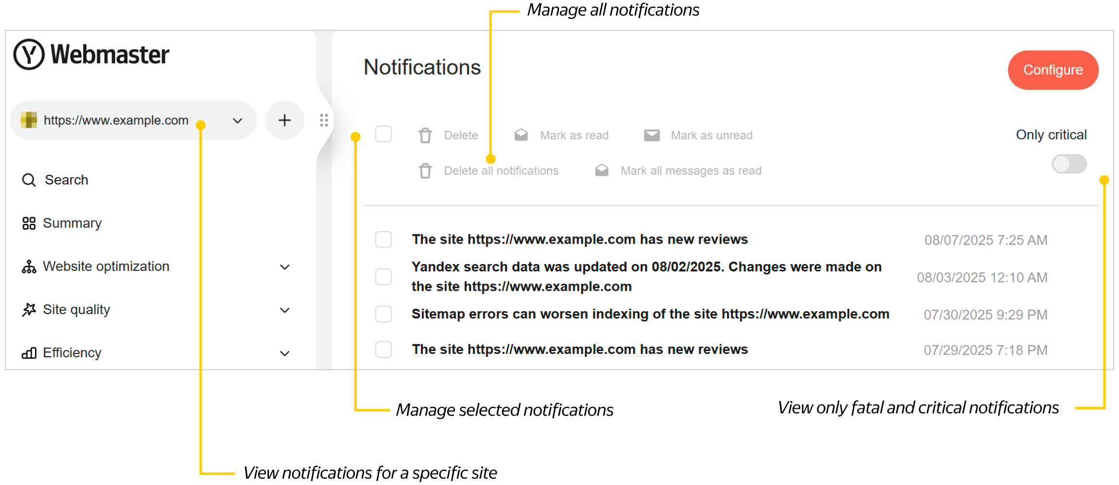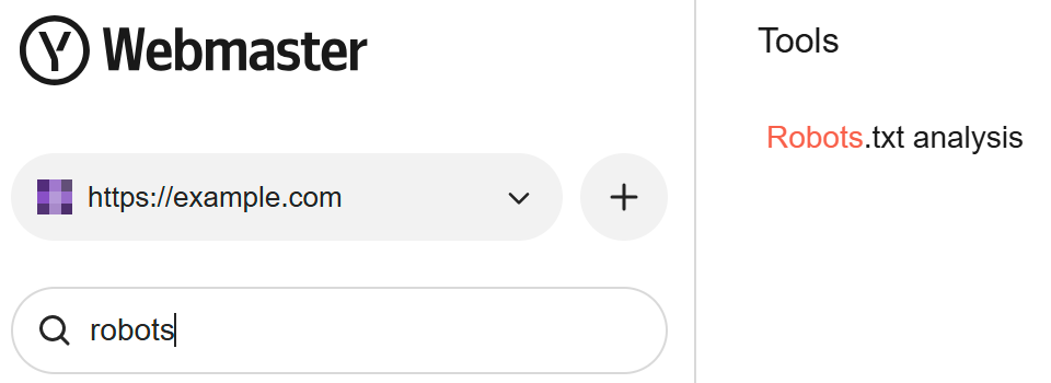 To quickly navigate to any section in Yandex Webmaster, start typing its name in the search bar in the side menu and select the menu item you need.