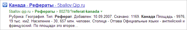 Для страниц с описанием рефератов и подобных работ в результатах поиска могут отображаться специальные сниппеты. В сниппеты включается описание наиболее важное для пользователя. Например, рубрика, тип работы (реферат, курсовая, диплом, доклад и пр.), дата добавления, количество скачиваний, аннотация или оглавление.