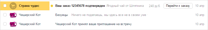 Письма, которые клиенты получают от вас, могут быть оформлены специальным образом в списке входящих сообщений. Для этого необходимо добавить в письмо информацию о заказе с помощью разметки Schema.org.