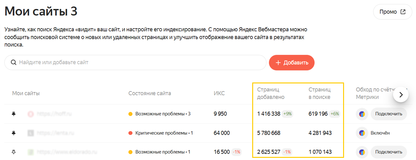 Проверьте количество загруженных роботом страниц и страниц, которые участвуют в поиске. Для этого перейдите в Вебмастер на страницу Мои сайты. Если число загруженных страниц сильно превышает число страниц в поиске, то, вероятно, робот находит на сайте большое количество однотипных страниц, страниц-дублей, которые не должны индексироваться.