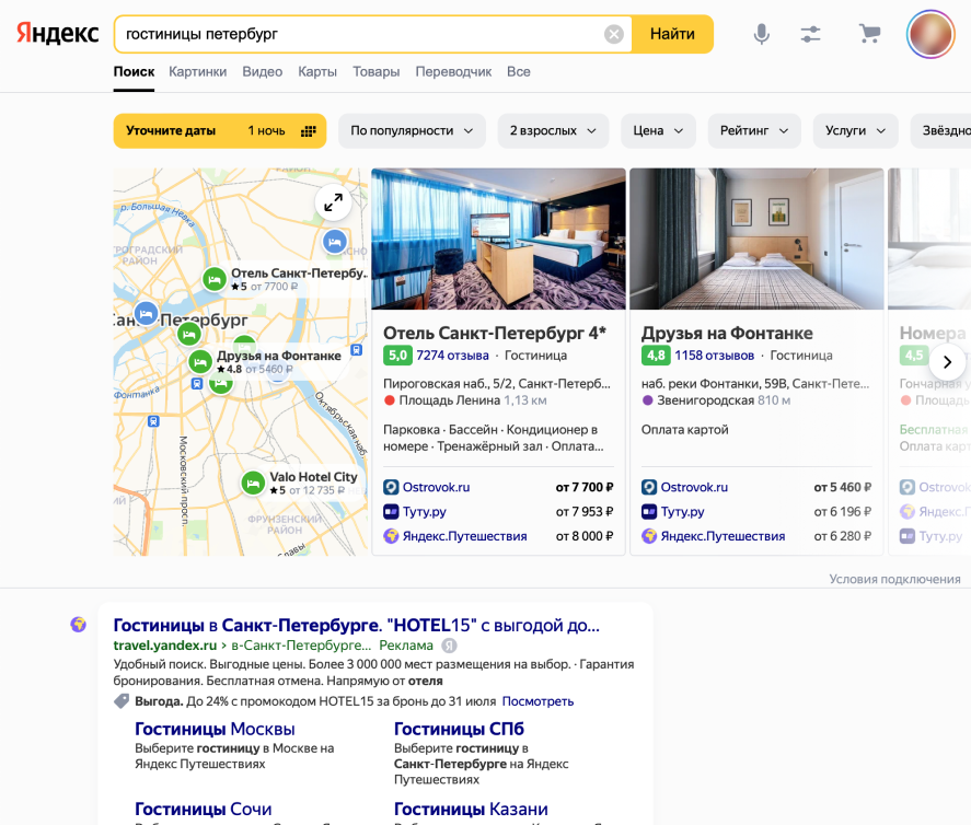 Содержит фото, названия, адреса, рейтинги, цены и условия размещения в гостиницах, а также отметки на карте. Когда пользователь ищет информацию о вариантах проживания, Поиск может показать ему карусель из карточек гостиниц, которые лучше всего соответствуют запросу. Кнопки над таким ответом позволяют пользователю уточнить запрос (например, изменить даты и количество проживающих), не покидая страницу поисковой выдачи. Также можно раскрыть карту и выбрать отель по расположению на местности.