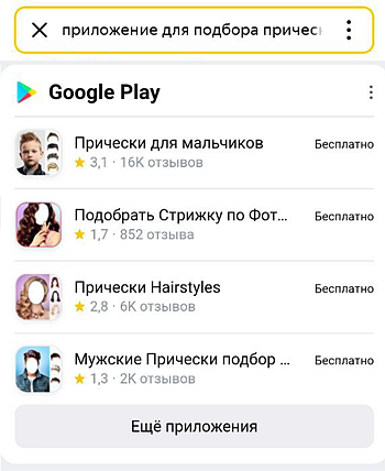 Содержит список приложений, которые подходят под поисковый запрос пользователя, в мобильной выдаче Яндекса. Пользователь может выбрать приложение из списка и перейти в магазин приложений — чтобы ознакомиться с подробной информацией и установить приложение на устройство.