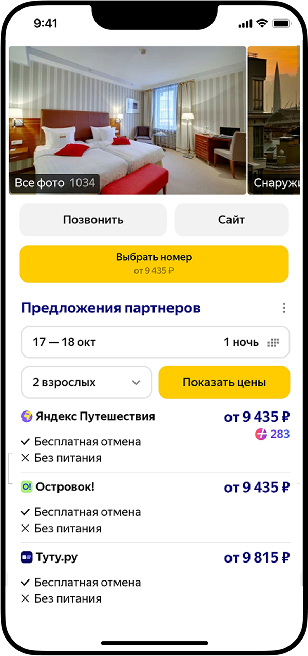 Содержит фото, названия, адреса, рейтинги, цены и условия размещения в объектах, а также отметки на карте. Когда пользователь ищет информацию о вариантах проживания, Поиск может показать ему карусель из карточек объектов, которые лучше всего соответствуют запросу. Кнопки над таким ответом позволяют пользователю уточнить запрос (например, изменить даты и количество проживающих), не покидая страницу поисковой выдачи. Также можно раскрыть карту и выбрать объект по расположению на местности.