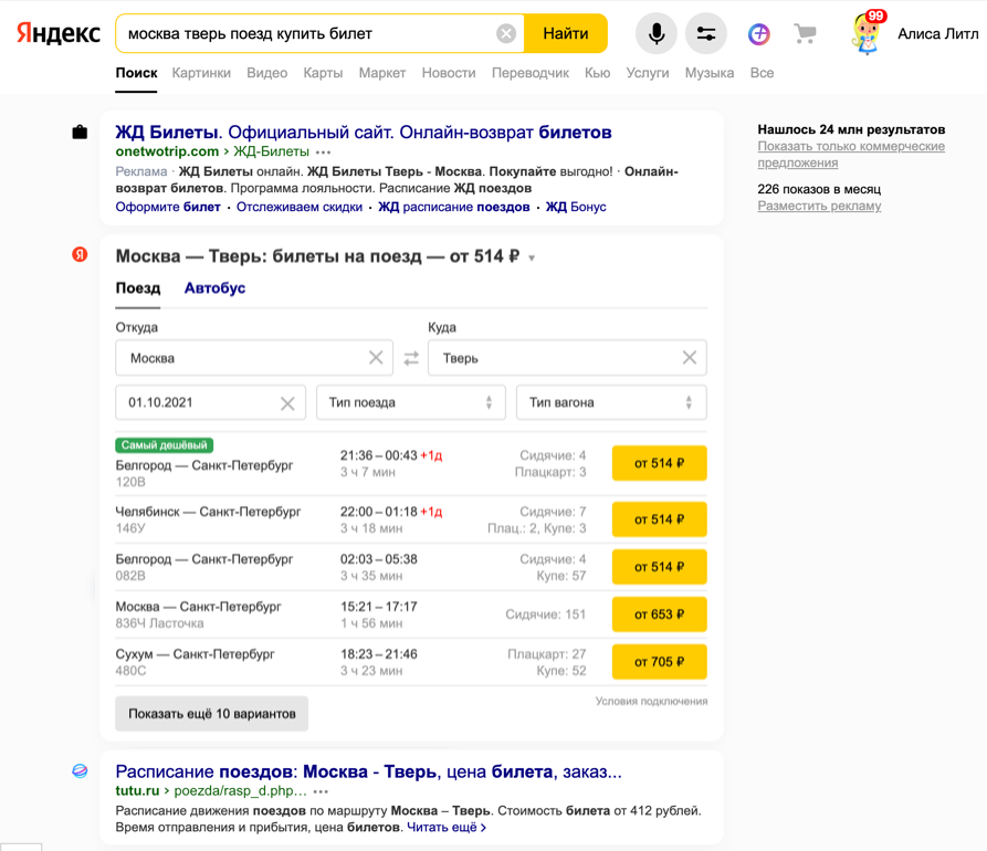 Содержит варианты поездок с ценами на интересующие пользователя даты. Пользователь может указать требования к типу вагона и поезда, изменить направления и даты, увидеть количество свободных мест, не покидая страницу поисковой выдачи, а затем перейти к покупке билета на сайте партнера.
