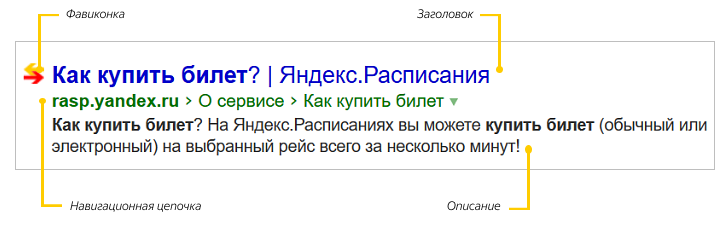 Благодаря сниппету пользователь получает представление о странице или нужную информацию, не заходя на сайт. В сниппете могут отображаться:
