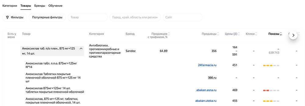 Чтобы воспользоваться инструментом, перейдите на страницу Эффективность → Аналитика трафика и ассортимента (β) и на нужную вкладку: Товары или Медицина.
