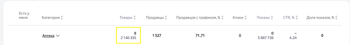 Во вкладке Категории можно посмотреть аналитику товаров по разным категориям (Аптека, Бытовая техника, Детские товары и другие).