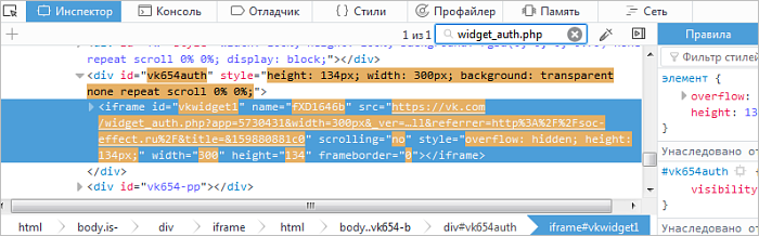 Если на вкладке Инспектор искомый фрагмент кода не обнаружен, но на вкладке Сеть есть обращения к социальной сети по указанным выше адресам — вы зафиксировали кликджекинг.