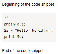 Start of a code snippet ``` <? phpinfo(); $s = "Hello, World!\n"; print $s; ``` End of the code snippetSee the result