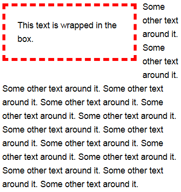 %%(wacko wrapper=box align=left width=170 border="5px dashed red")Text inside the block%%This text will wrap around the block. This text will wrap around the block. |