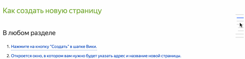 В режиме просмотра у правого края страницы расположена упрощенная схема содержания, состоящая из горизонтальных линий. Каждая линия соответствует заголовку на странице, длина линии зависит от уровня заголовка. При прокрутке страницы на схеме подсвечивается линия, соответствующая положению курсора на странице.