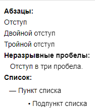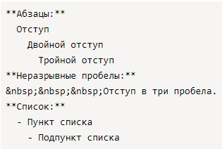 Отступы из пробелов в начале строки используются для оформления списков второго и третьего уровней.
