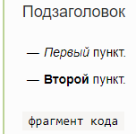 >#### Подзаголовок >* *Первый* пункт. >* **Второй** пункт. > >`фрагмент кода`Как выглядит результат