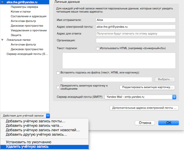 Нажмите на учетную запись правой кнопкой мыши (в списке папок) и выберите пункт Редактировать учетную запись.