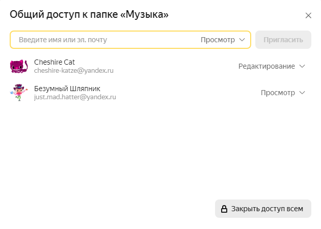 Чтобы получить доступ к папке, нужен аккаунт на Яндексе. Если у человека, которого вы пригласили, нет аккаунта, мы предложим ему зарегистрироваться.