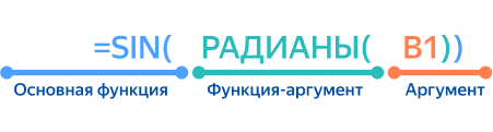 В примере вложенная функция РАДИАНЫ преобразует градусы из ячейки B1 в радианы, а затем функция SIN вычисляет значение синуса этого угла.