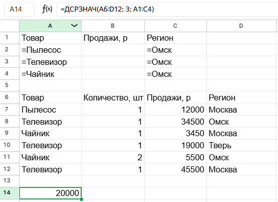 Функция вычислила среднее арифметическое для значений третьего столбца в регионе «Омск» в диапазоне A6:D12.