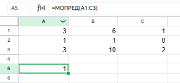 Вычисляет определитель матрицы в диапазоне A1:C3 по формуле =A1*(B2*C3-B3*C2)+A2*(B3*C1-B1*C3)+A3*(B1*C2-B2*C1)