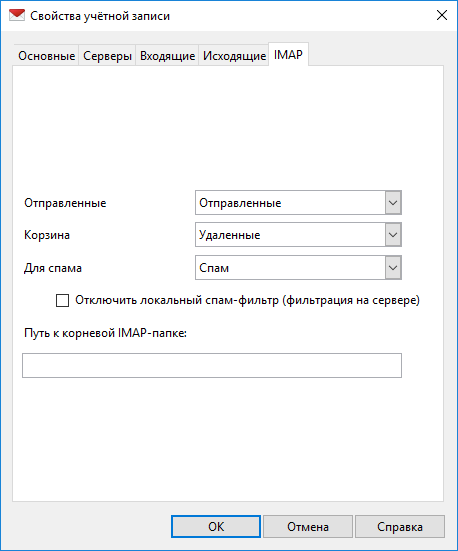 Перейдите на вкладку IMAP и настройте соответствия для папок Отправленные, Корзина и Для спама.