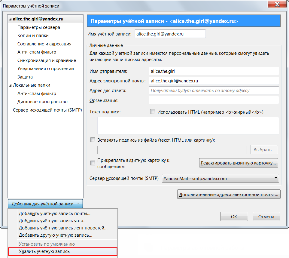 Нажмите на учетную запись правой кнопкой мыши (в списке папок) и выберите пункт Удалить почтовый ящик.