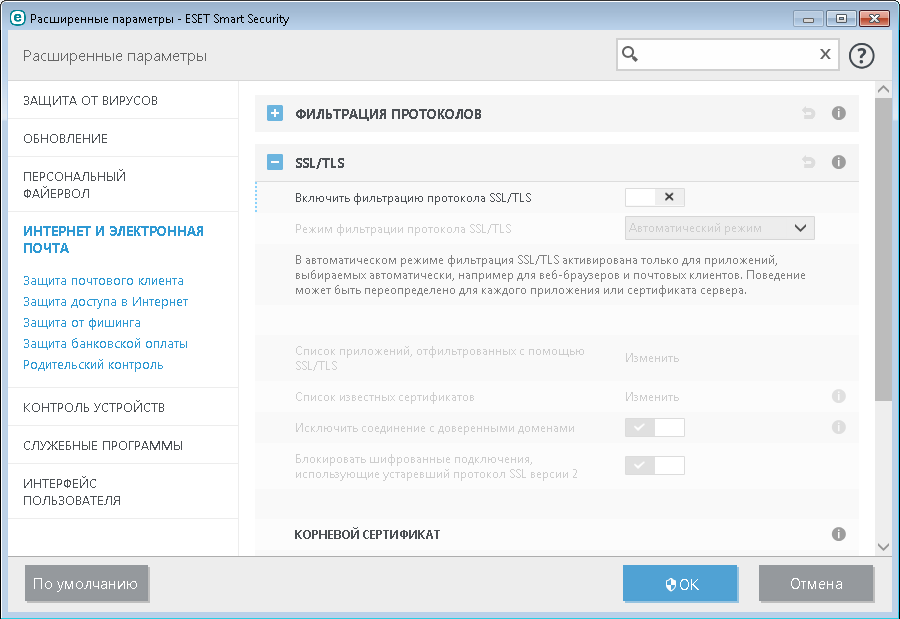 2. В блоке Интернет и электронная почтаSSL/TLS отключите опцию Включить фильтрацию протокола SSL/TLS.