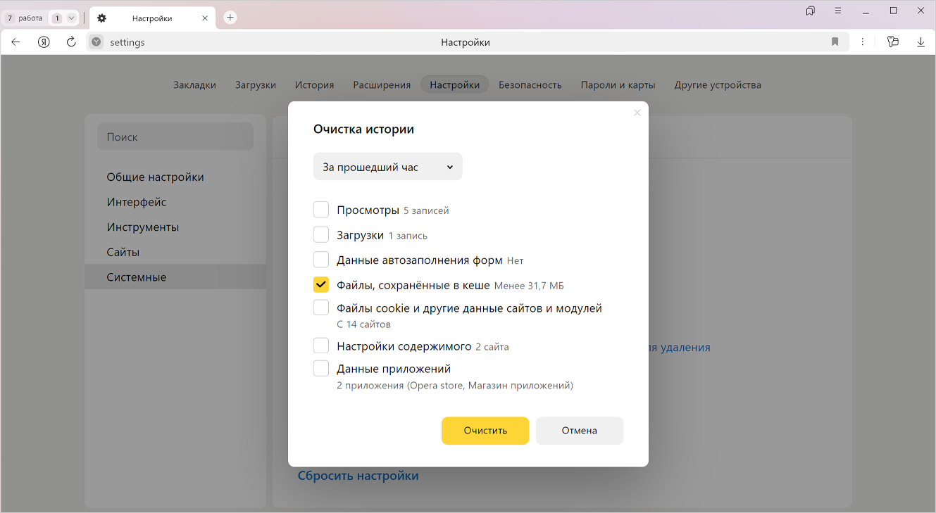 Отключите остальные опции (если хотите очистить только кеш Браузера).