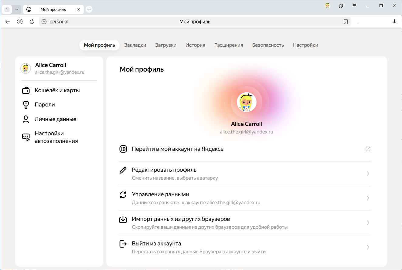 Мой профиль — это рабочее пространство в интернете, в котором хранятся все ваши настройки, история работы с сайтами, закладки и открытые вкладки, а также cookie, входы на сайты и способы оплаты.