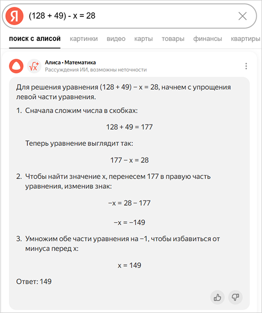 Алиса может решать текстовые задачи и уравнения по математике до 11 класса включительно.