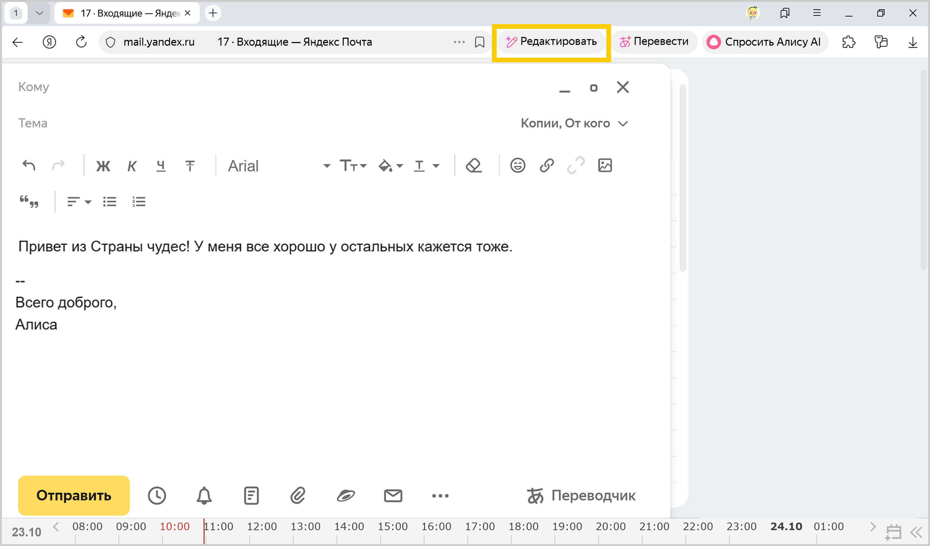 Редактор в Браузере помогает написать, отредактировать и улучшить текст, используя Алису AI. Он исправит ошибки, улучшит стиль, переформулирует или переведет текст на другой язык. Это удобно при подготовке любых текстов: от электронных писем и постов в социальных сетях до научных статей и художественных произведений.