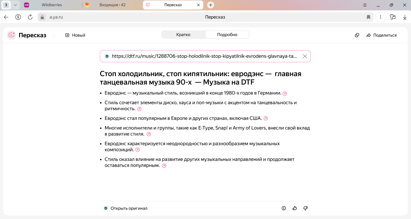 Нейросеть YandexGPT перескажет что угодно: любой длины текст, статью или документ, а также видео на платформах YouTube, Дзен, Rutube и VK. Добавьте ссылку на материал или загрузите с устройства файл формата DOC, PDF или TXT, а нейросеть выделит основные тезисы, чтобы вы быстро поняли главное.