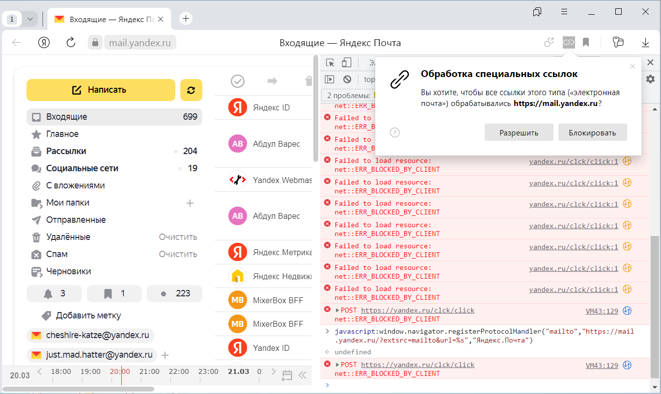 Если в правой части Умной строки нет значка , назначьте Яндекс Почту обработчиком с помощью консоли JavaScript: