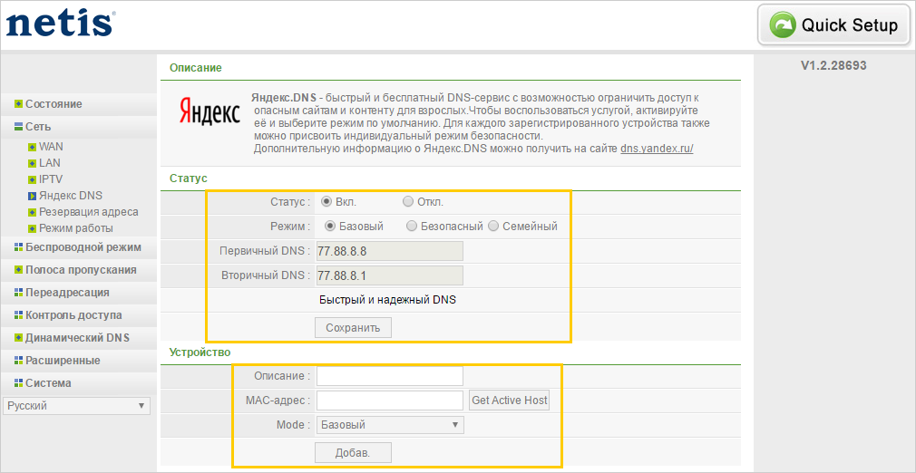 Яндекс DNS встроен в большинство роутеров Netis. Его можно настроить для отдельных устройств или для всех сразу.