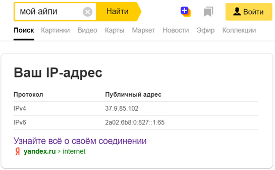 Или воспользуйтесь колдунщиком, который умеет показывать IP-адрес пользователя. По запросам типа [узнать мой IP или даже просто [мой айпи] колдунщик показывает адрес и предлагает узнать больше об интернет-соединении.